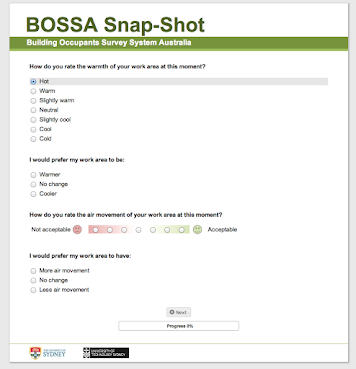 The BOSSA Snap-Shot instantaneous IEQ questionnaire is designed to be accompanied by simultaneous objective measurements with our BOSSA Nova Cart on the key IEQ dimensions of indoor air quality, thermal environment, lighting and acoustics.